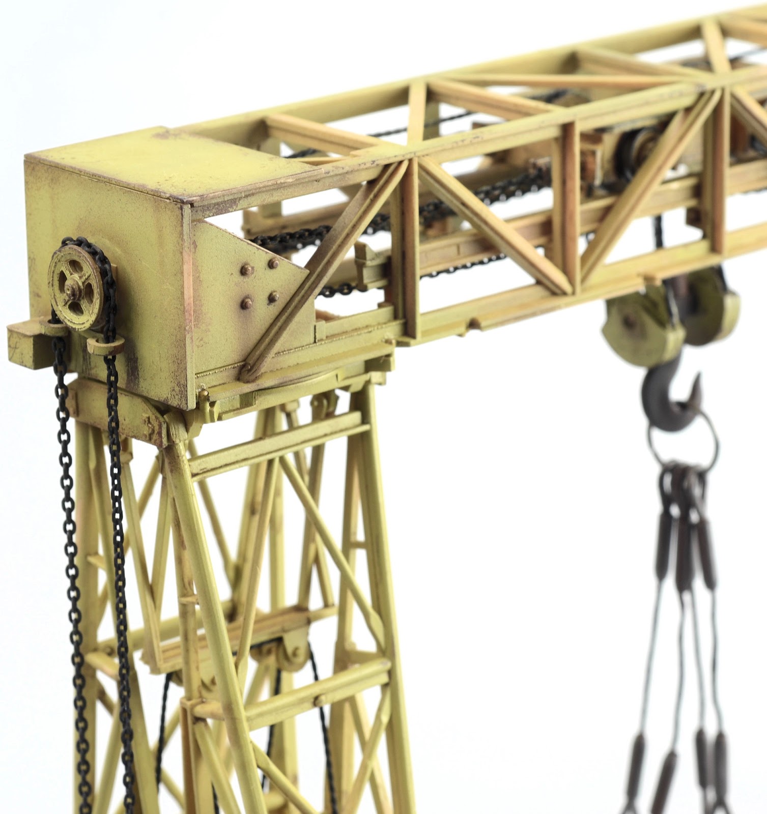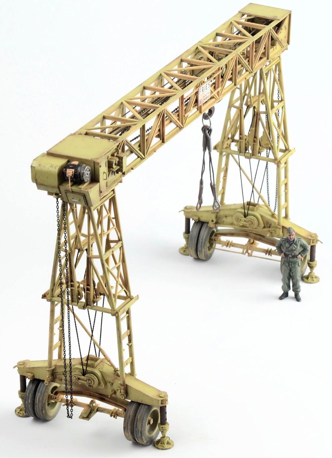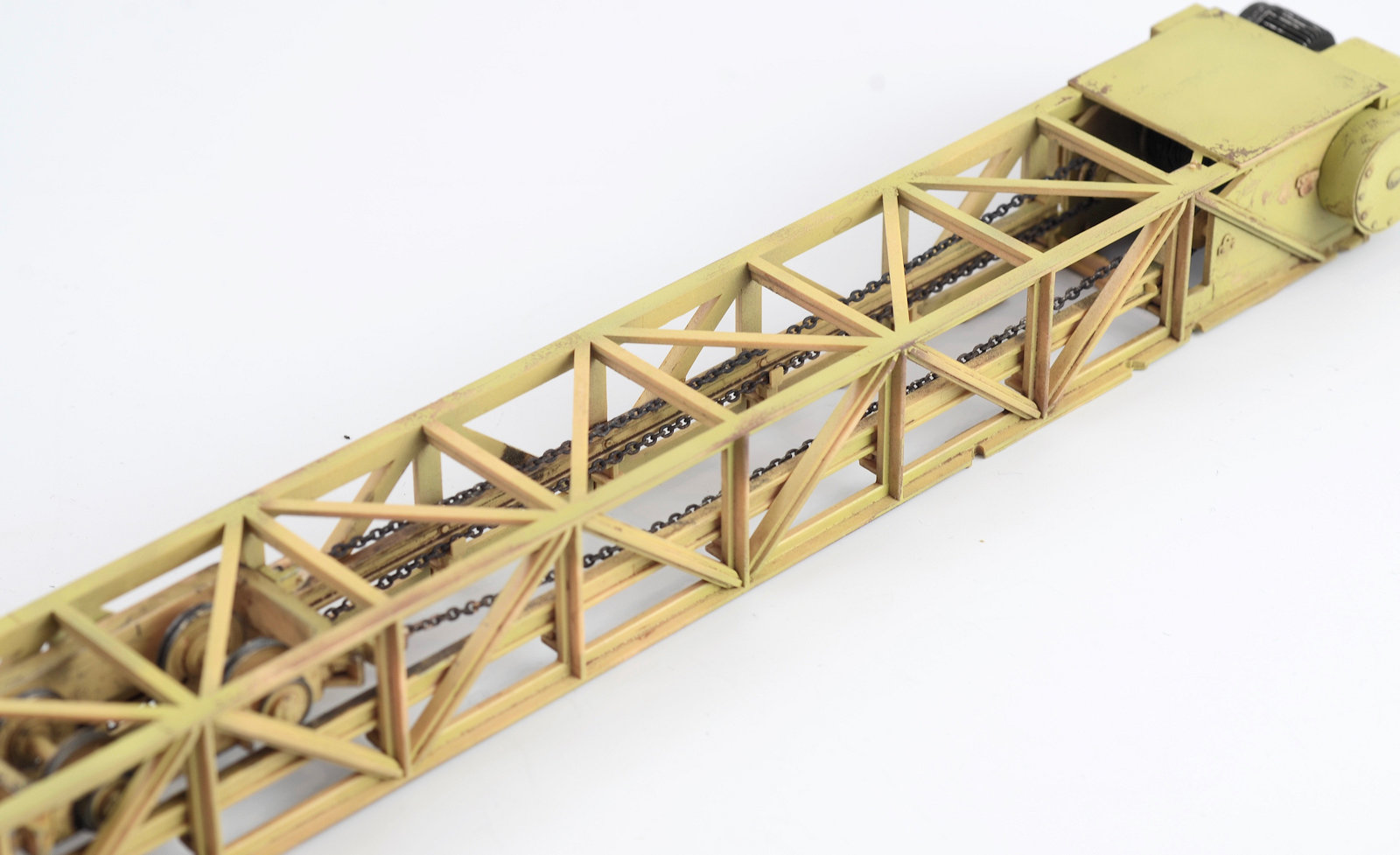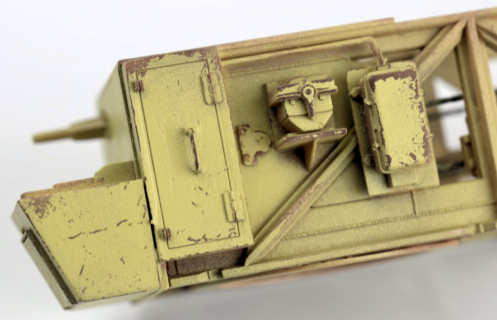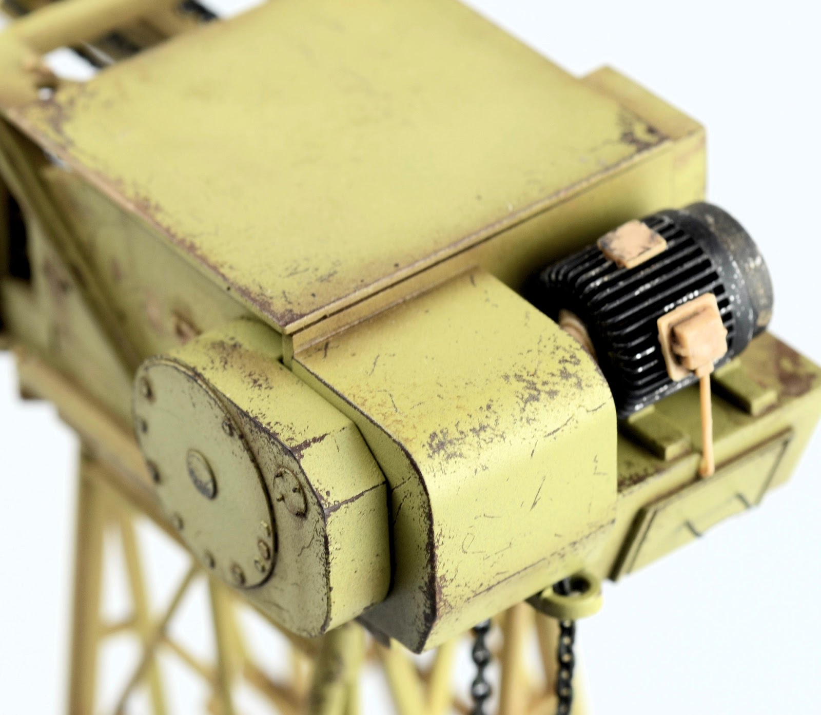 I figured the supports for the crane would have suffered quite a bit of wear, so I went about weathering them as individual elements. The chipping was produced using a basic hairspray technique. The grab handles were replaced with brass wire. The supports are now attached in place. You may also not that the wheel assemblies have the ability to pivot and rotate.