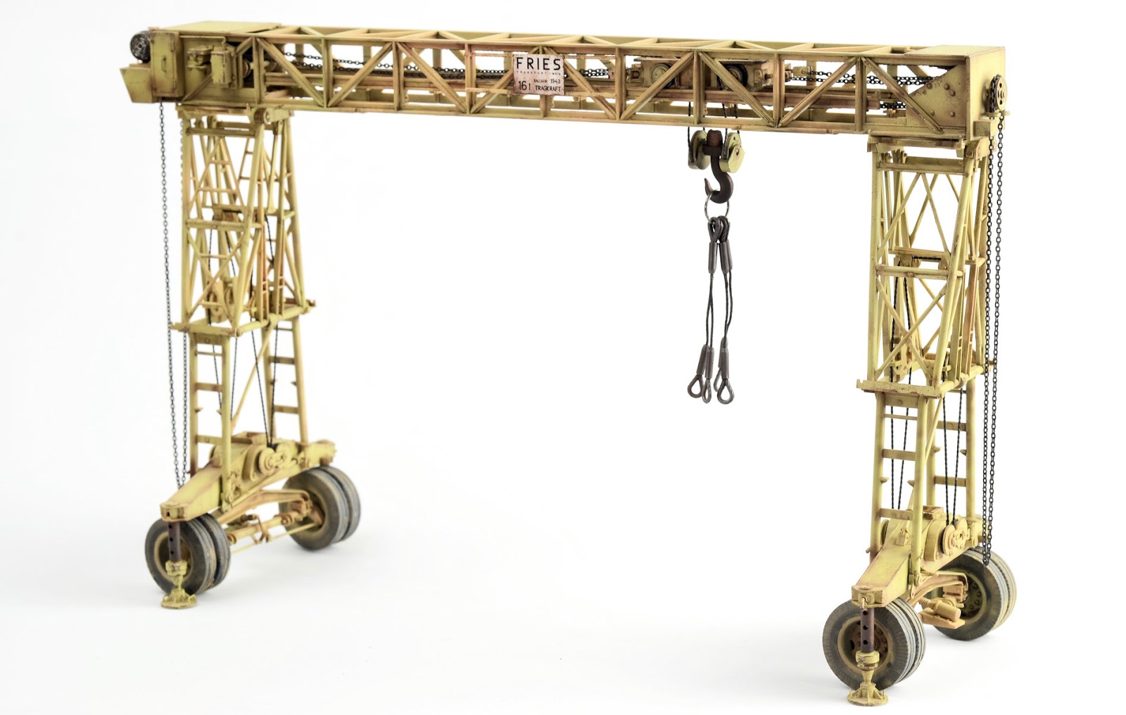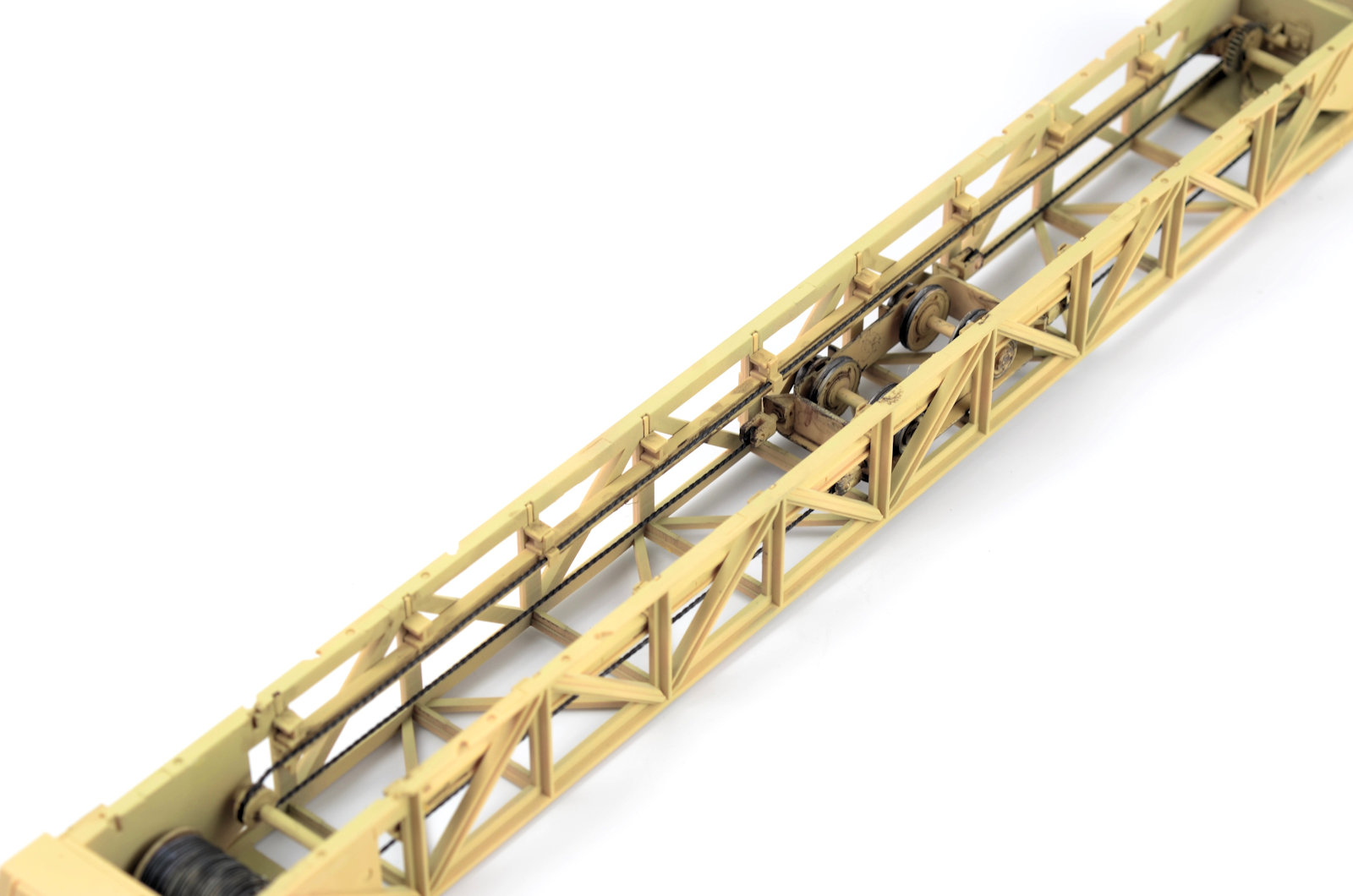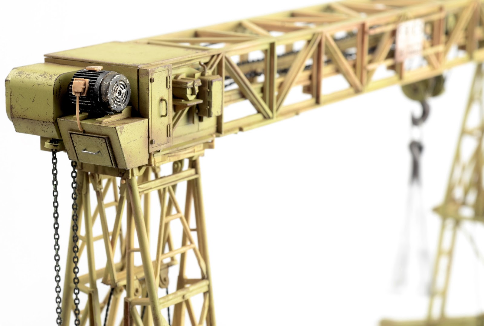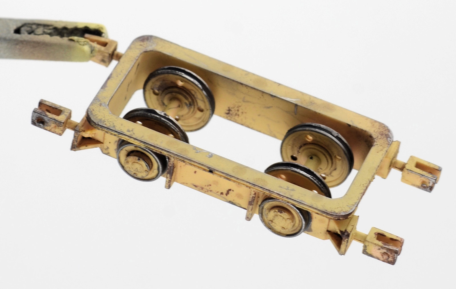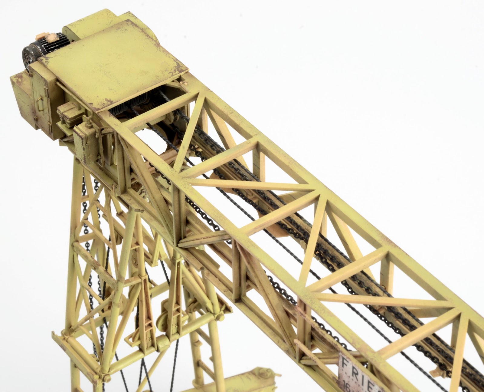 I figured the supports for the crane would have suffered quite a bit of wear, so I went about weathering them as individual elements. The chipping was produced using a basic hairspray technique. The grab handles were replaced with brass wire. The supports are now attached in place. You may also not that the wheel assemblies have the ability to pivot and rotate.
