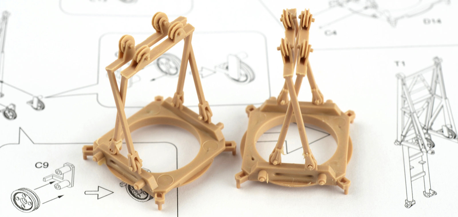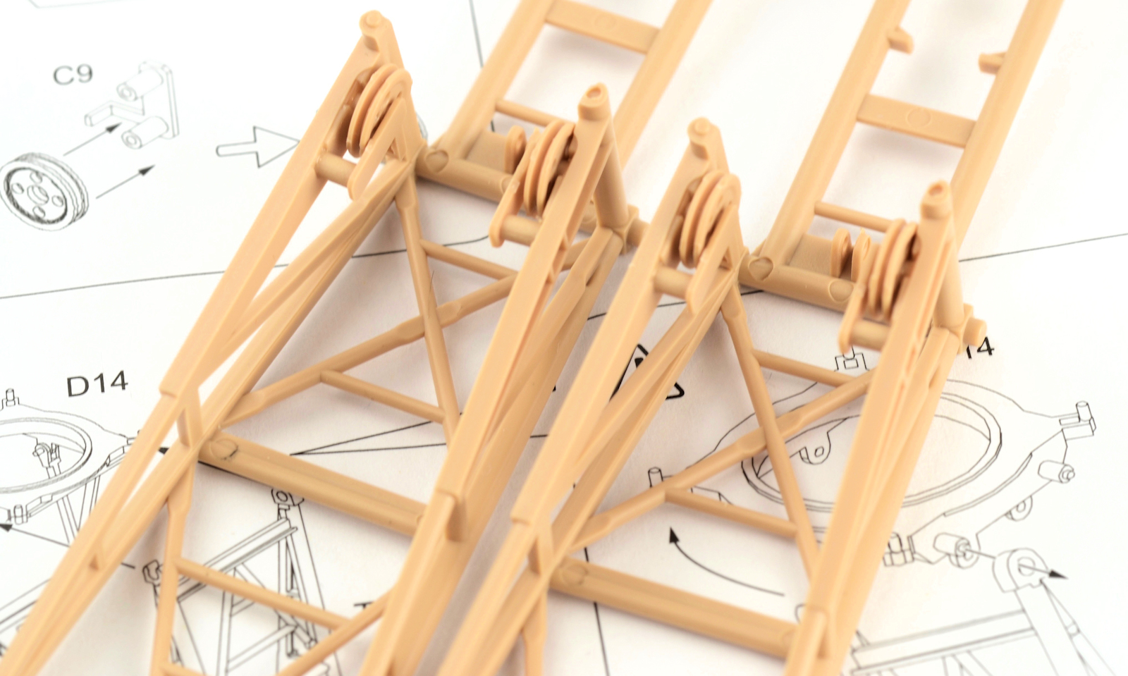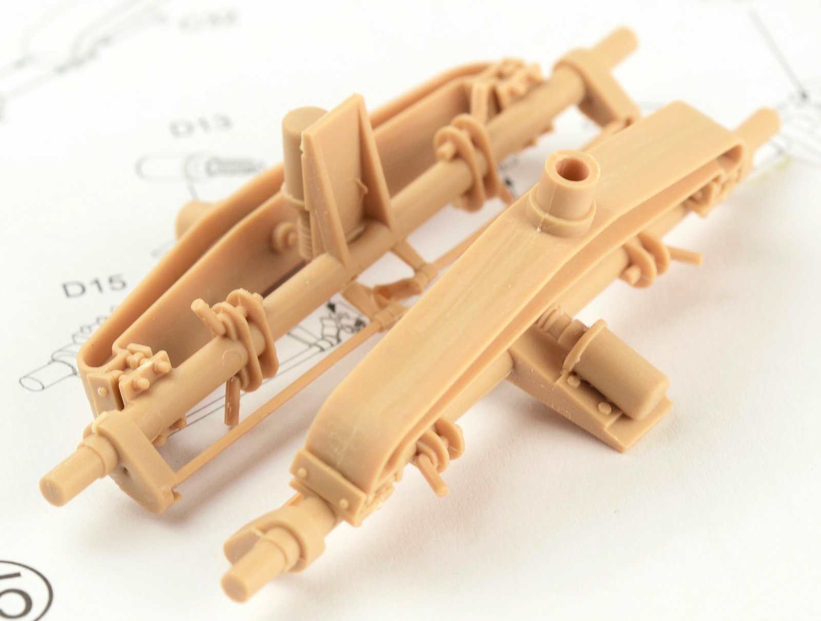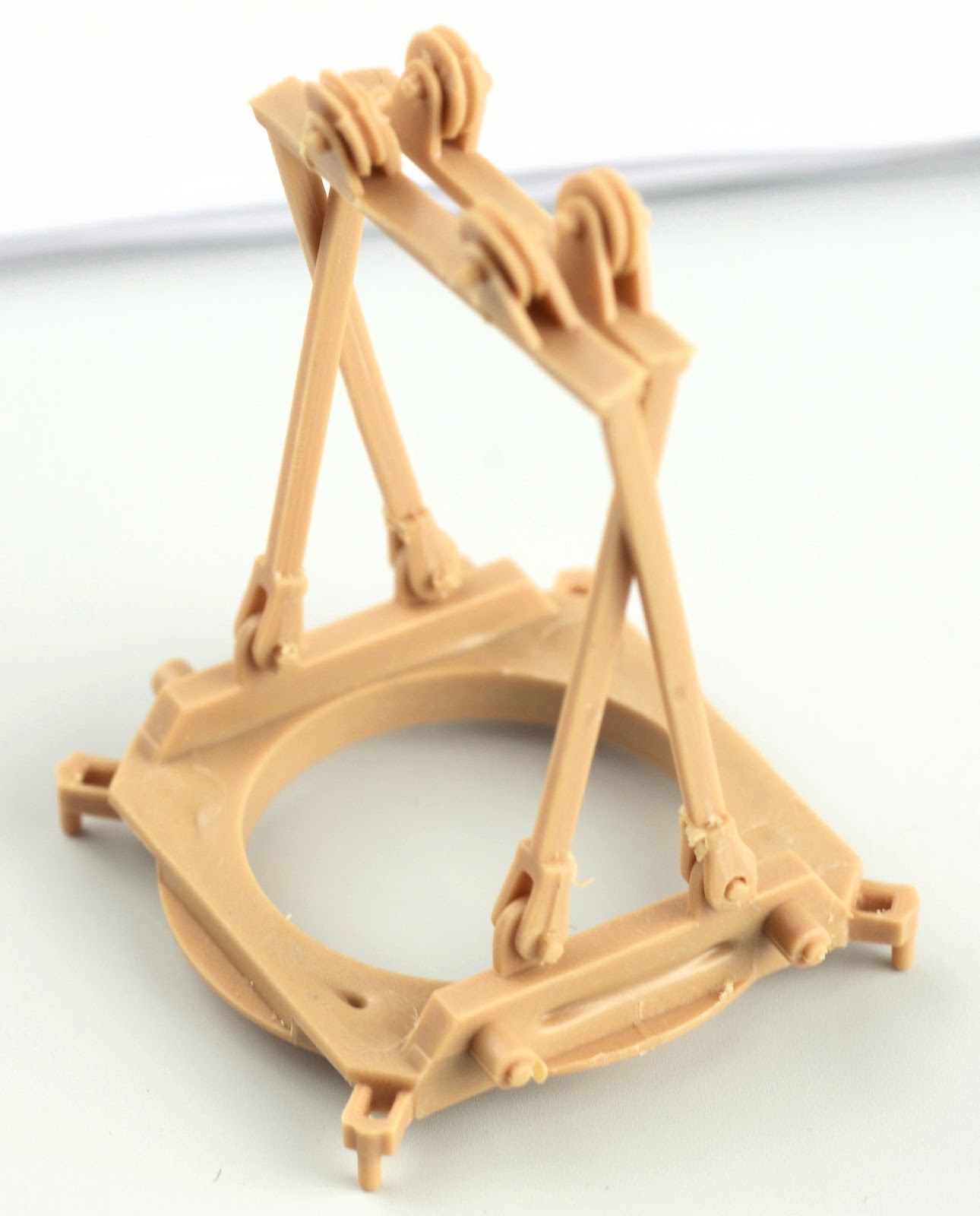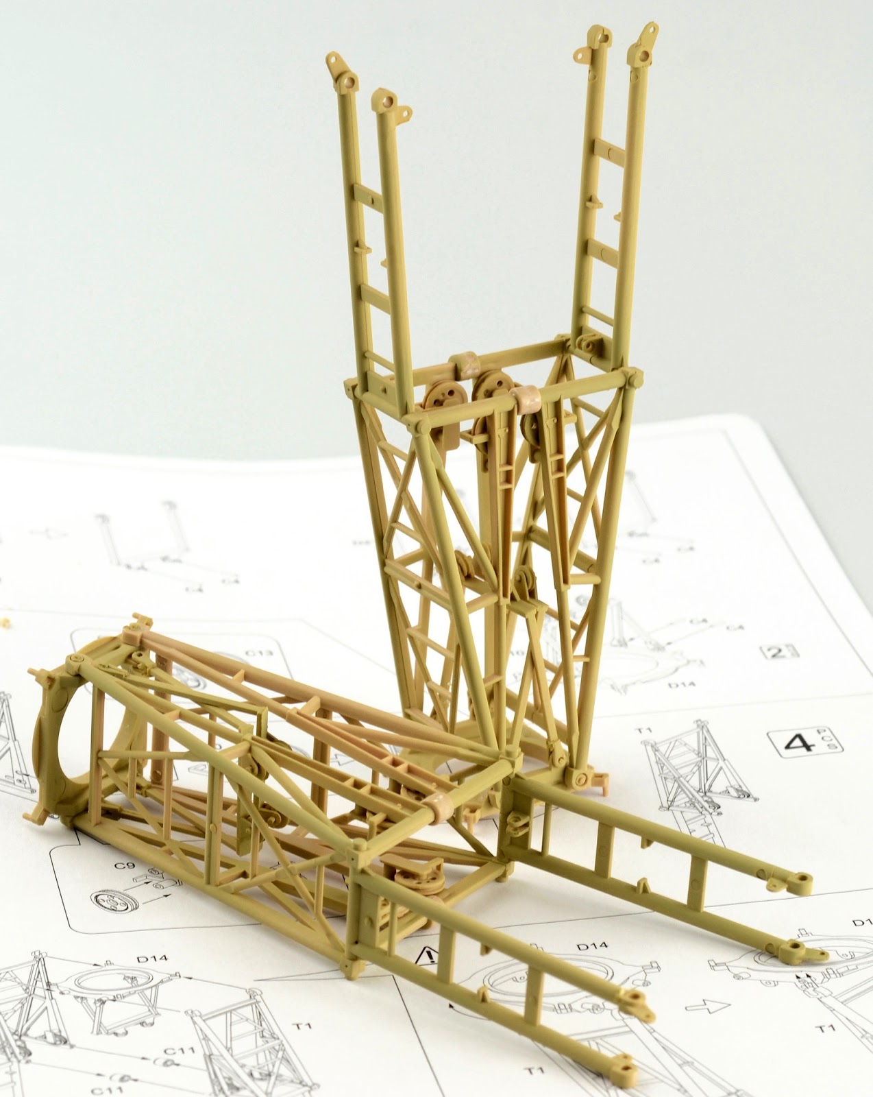 The legs of the crane and moulded in 2 solid pieces per side. This is great for the strength of the completed model, but it means that there is no option to pose the crane in a transportation scenario. Construction is very simple, but again you may notice some quite obvious ejector pin marks in the parts. A little closer and you can see what I mean.