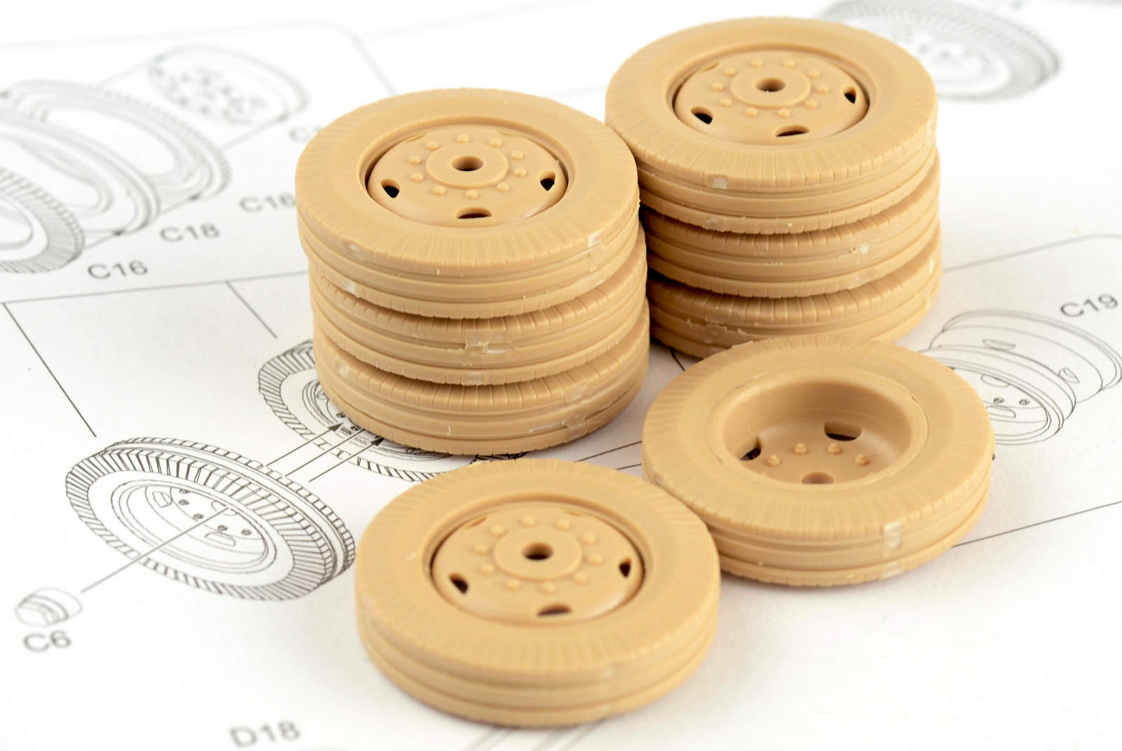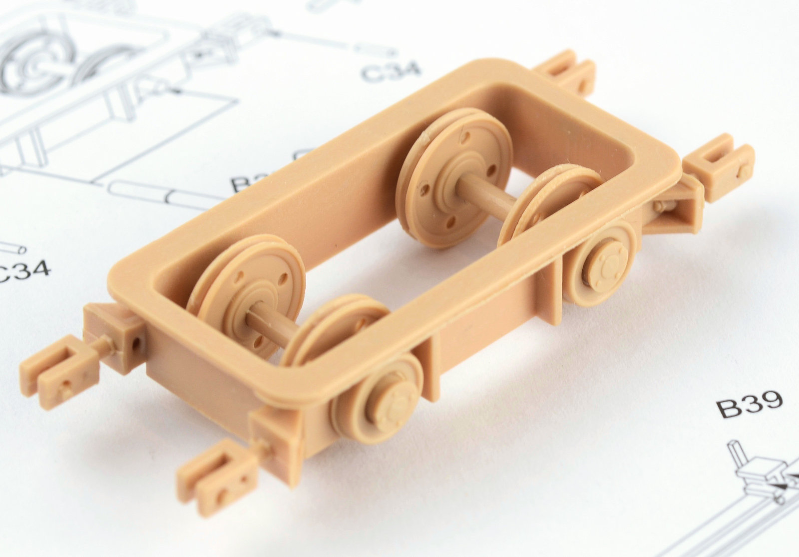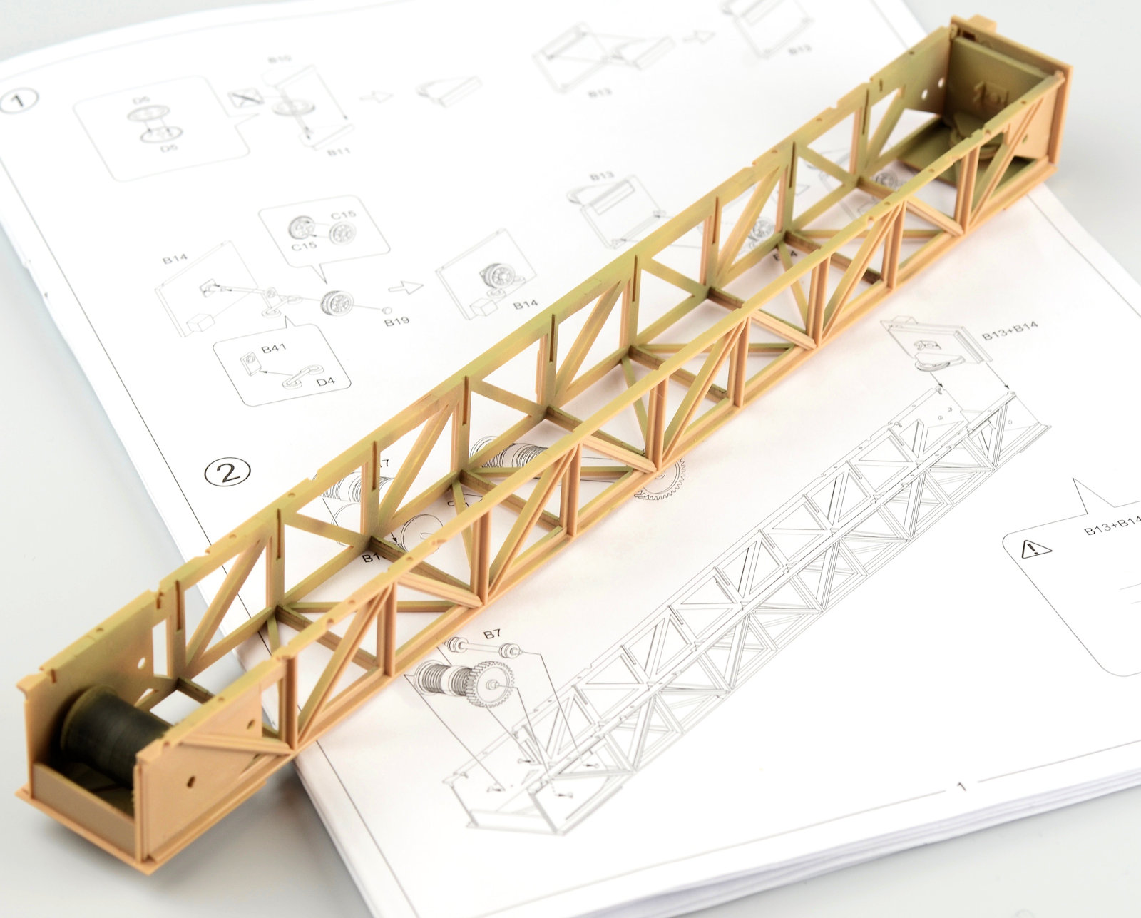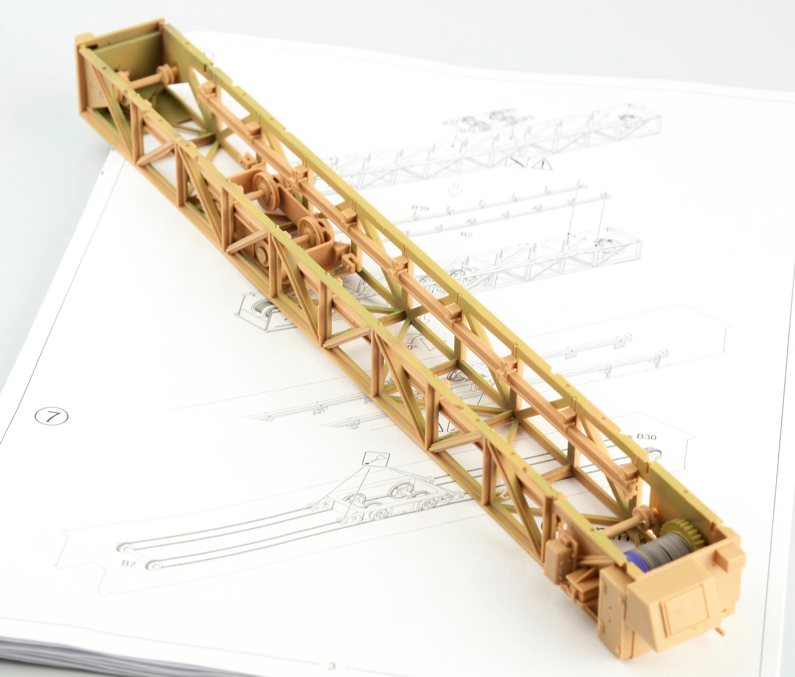 Now only the axels and the structure for the wheel sections. Quite a bit of clean up on these pieces. I probably wasn¡¯t as thorough as I should have been, but a lot of these pieces will be obscured when complete. The large support arms and pullies are assembled. A word of caution – Fit D17 to the main part before glueing D9. It will ensure the spacing of the pieces is correct. I made the mistake of fitting D9 to D17 first and it didn¡¯t sit properly on the main piece¡¦ just trust me on that one!The wheels are now assembled. Each wheel consists of or 4 pieces. The inside and outside face of the tyre and a centre section produce the ¡®rubber¡¯ section and the wheel than pushes through the 3 pieces. The way the parts clipped off the sprues was pretty nasty. I am using God Hand sprue cutters¡¦so they are pretty good. A little more clean up required here. Now back to the top structure. I felt the spool in the top section looked a little dull (plus there was a massive join showing where the pieces connected). I figured the easiest way to give the piece a lift was to wrap some wire around the part, giving the illusion of cable around the spool. Accurate? Probably not. I was just looking to add some depth to the part. This would later be painted. The trolley and the pulleys are now fit into the top section. Two long pieces are attached to either side of the frame at this stage. This now means the trolley should not technically fall out of the structure when spun around (sorry¡¦ sounds confusing doesn¡¯t it? It¡¯s not¡¦it¡¯s just hard to explain!)The pulleys that will sit on the each of the outside arms of the crane are now assembled. As you can see there are some really obvious ejector pin marks and some pretty deep sink marks. All of these marks really need some attention, but I wasn¡¯t prepared to invest the time in doing that on issues that would be very hard to detect at the end of the build. By all means, I would encourage people to fill and sand, but I just couldn¡¯t spare the time.