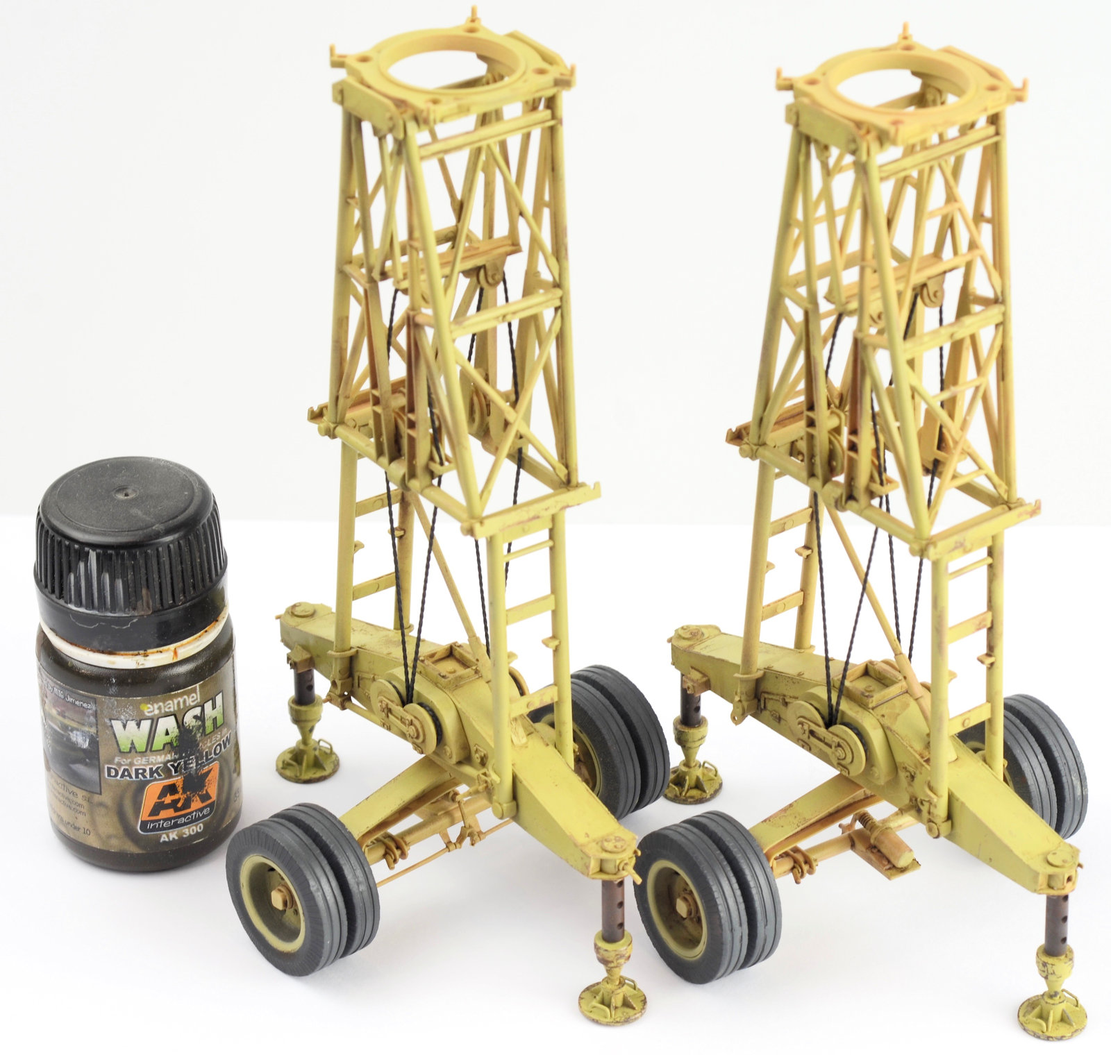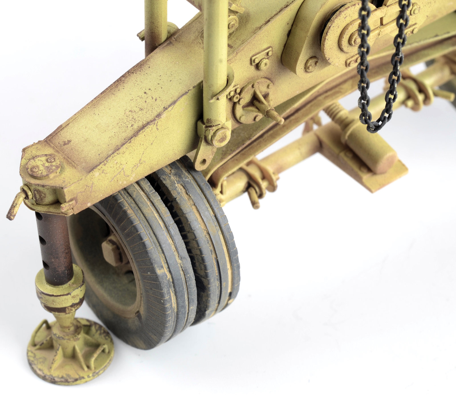 Next, the ropes are fed through the pulleys on the main leg sections. I needed to drill out the small pulleys at the top of the structure because the rope wouldn¡¯t feed through them, but this was a pretty simple procedure. I used a small dab of superglue at each pully as I worked through the wiring. By doing that I was able to keep a good tension through the rope. The kit comes with a length of chain. It is bright gold! I tried painting a small section as a test, but it was very difficult to get a decent coverage due to the movement in the chain. I decided to try the AK Burnishing Fluid on it, and to my surprise, it came out a treat!With the main leg assemblies now complete, a light wash using a brown enamel was now applied to the details and recesses.It was about now I realized that I had used the rope and not the chain in the top section of the model. I came to this realization because I didn¡¯t have enough rope to finish the model, but I had a stack of chain left. I set about removing the ropes and fitting the chain. I have to say, this was one of the most frustrating things I have ever done. The pins in the shackles of the trolley are too thick to pin the link in the chains. The trolley keeps moving and all the while you are trying to keep the chain around the pullies and keep tension through it all. In the end, I used some fine mending thread and tied the chains to the pins in the trolley. It actually looks OK, but be warned, this step very tricky. I can¡¯t think of a better way to do this¡¦ That said, the chain looks really good in the structure and adds a lot of realism to the model. To further enhance some of the chipping, a sponge with dark brown paint is carefully dabbed in some of the logically high wear areas. A heavily thinned mix of Clear Smoke and Rotbraun is now applied as a post-shade. I find this technique gives the model a real ¡®tired and used¡¯ look. The wheels are now treated to a basic pigment wash and the model is pretty much ready to go.