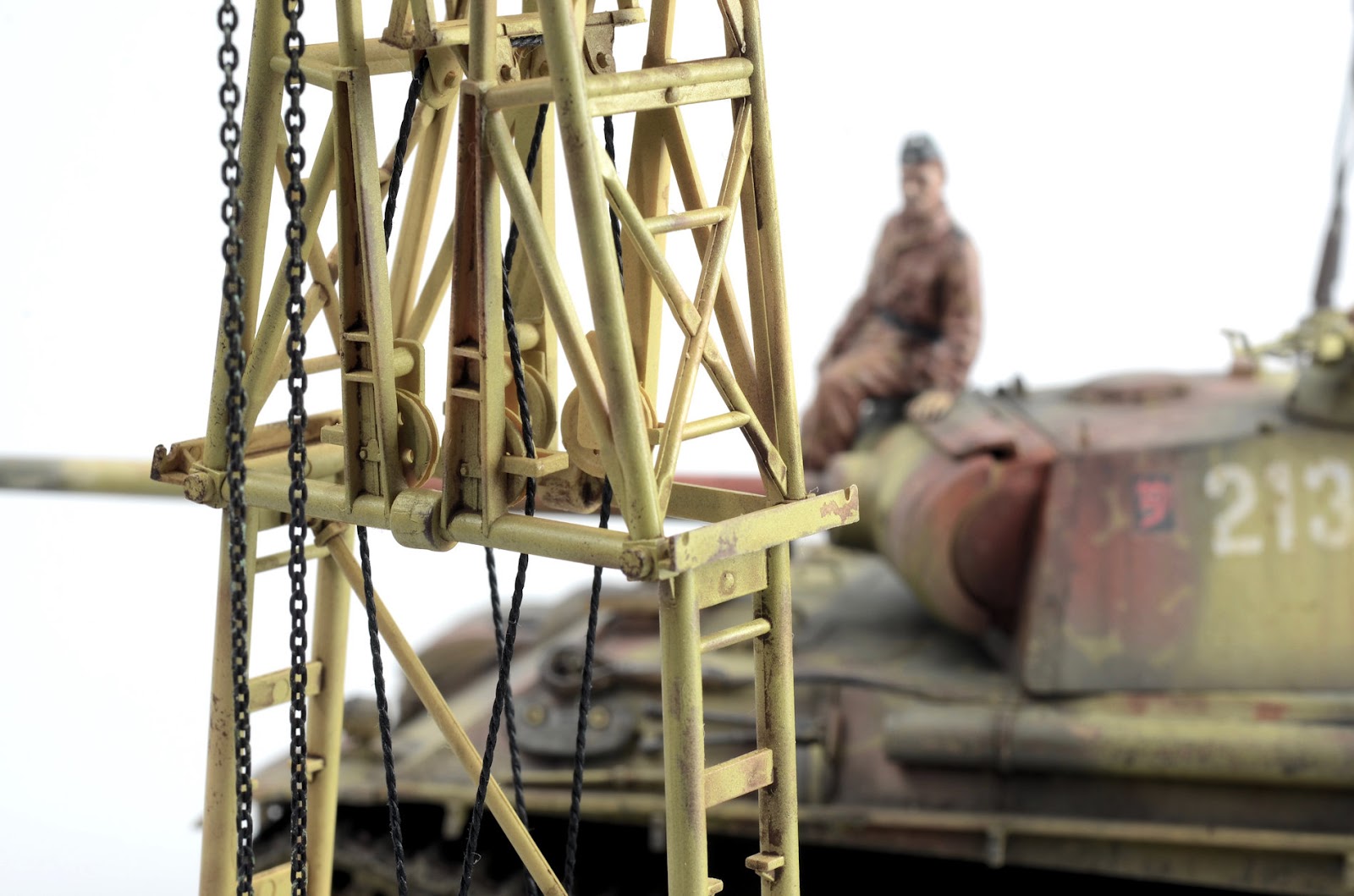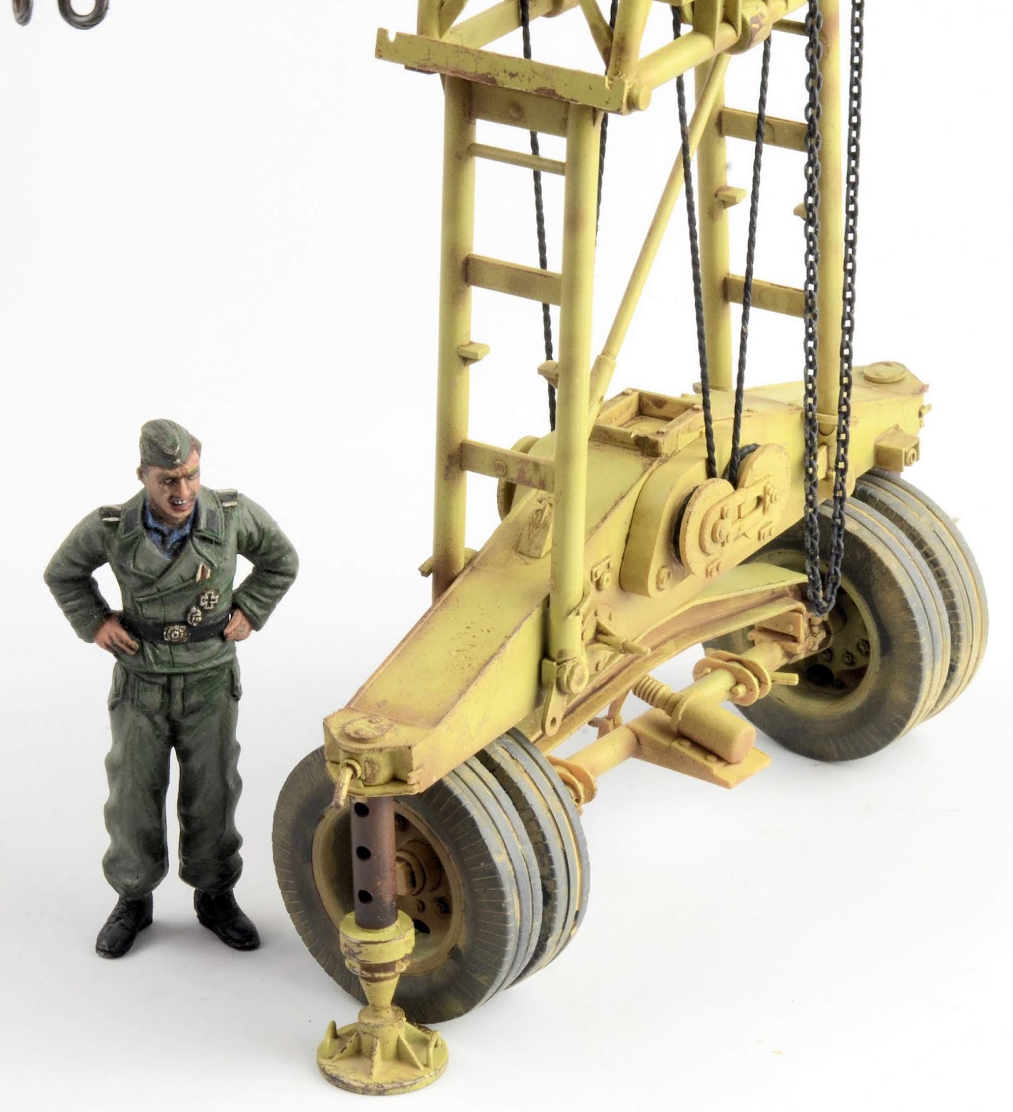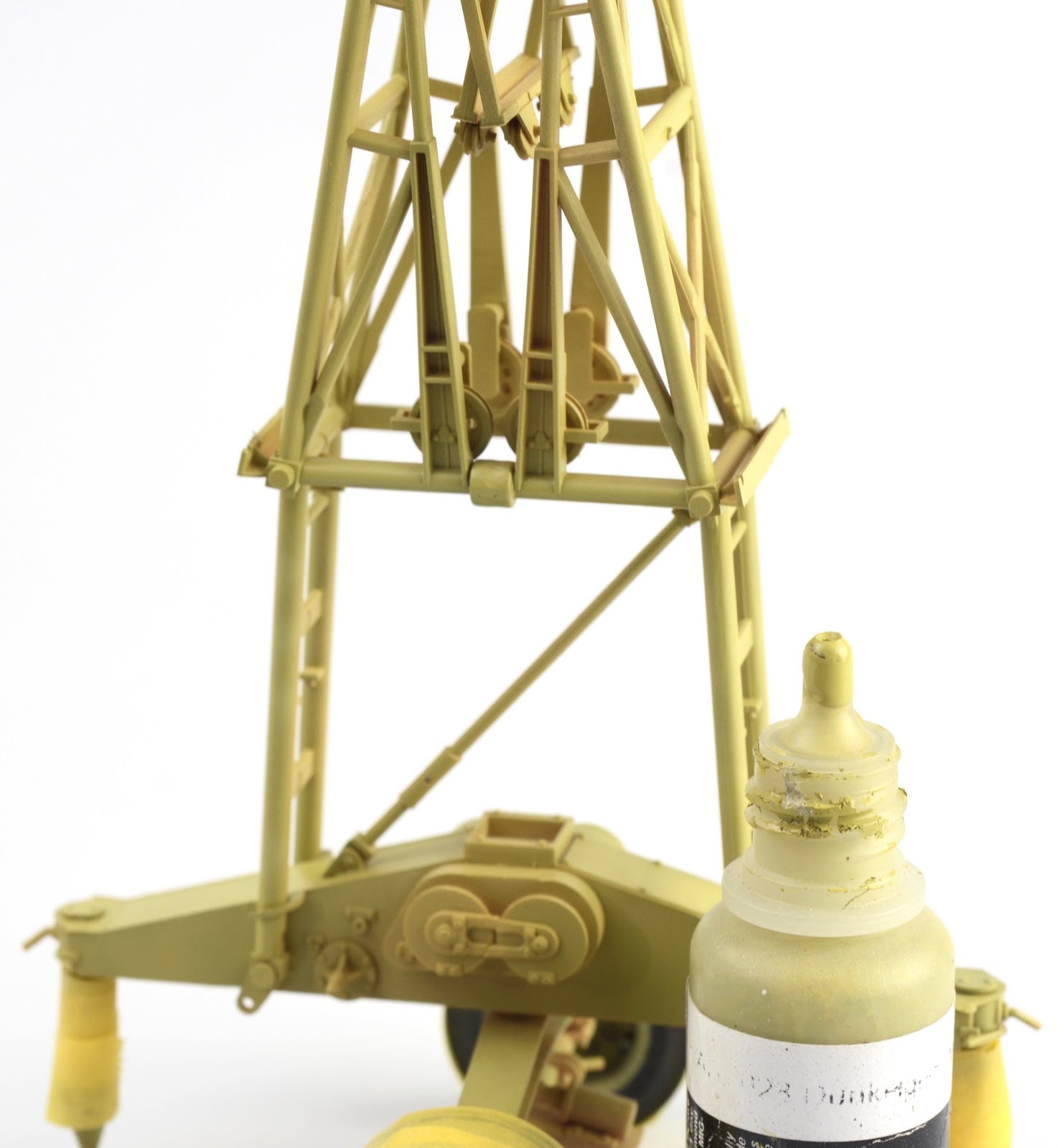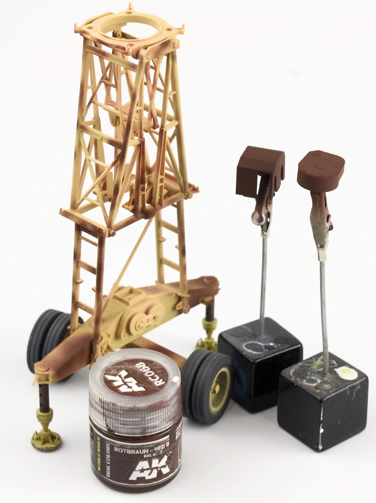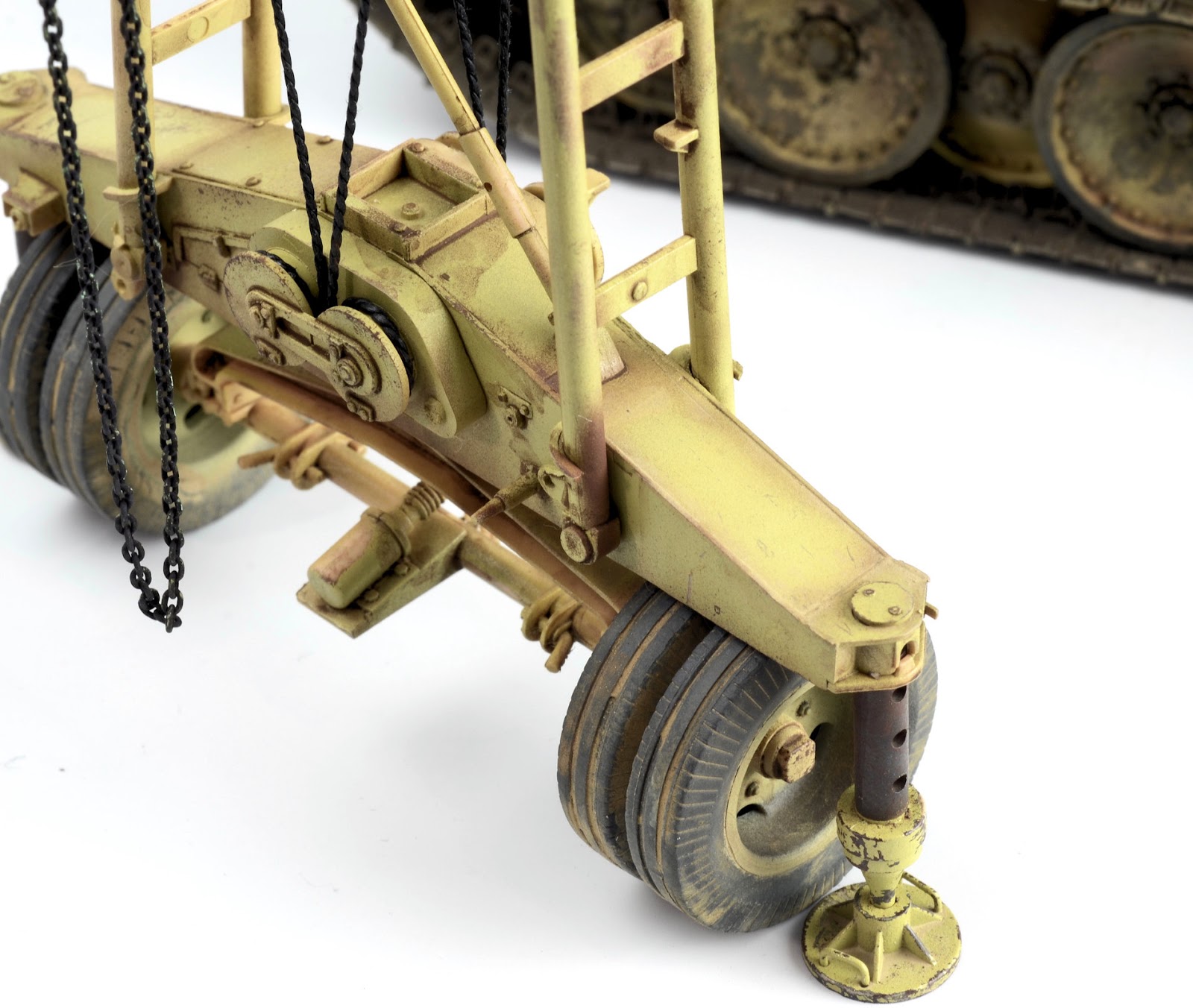 ROOKIE ERROR right here¡¦ Stupidly I didn¡¯t read the instruction sheet properly and rather than using the chain at this step, I used the rope supplied in the kit. I have left this faux-par in the guide to serve as a warning to others. Read the instructions properly! Back to this one later¡¦I wanted to represent the crane in a somewhat ¡®used¡¯ fashion¡¦but not too ¡®used¡¯ (if that makes any sense at all??) Some of the pieces were completely sprayed using AK Real Color Rotbraun, whilst others just have sections of the part sprayed in the colour. I find the lacquer offers a really sturdy base to build on. The parts then received a couple of coats of hairspray and once dry was painted using an acrylic-based Dunkelgelb. I find the hairspray chipping using the acrylic is a little more predictable than the lacquer paints. Once the paint has dried, a brush moistened with water is used to work away the top layer of paint to reveal the colour underneath. The effect is quite convincing.