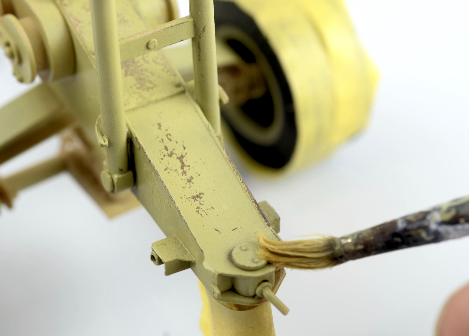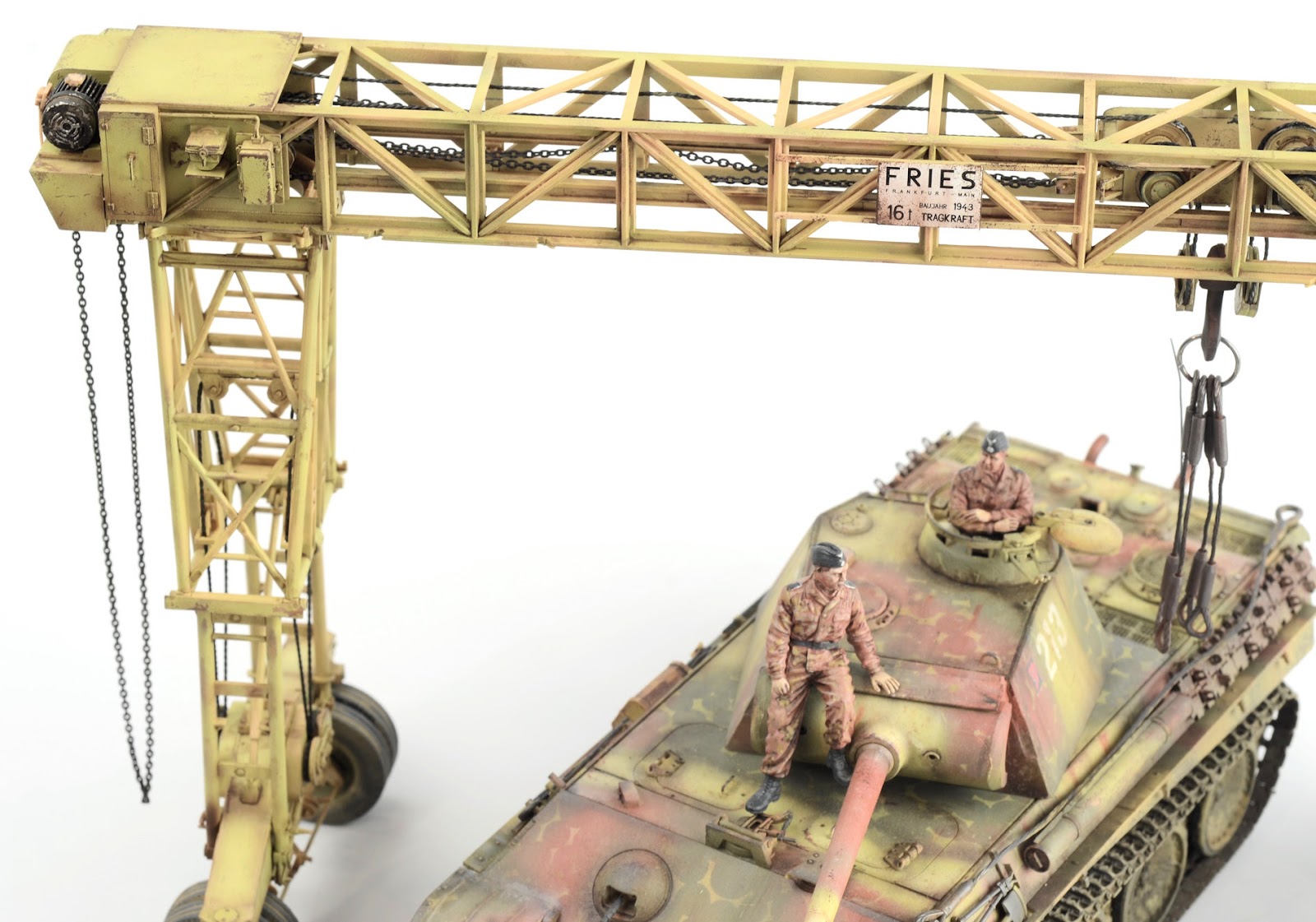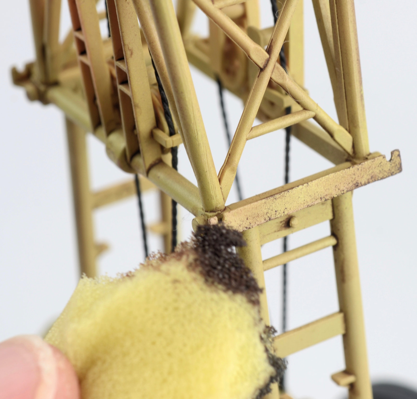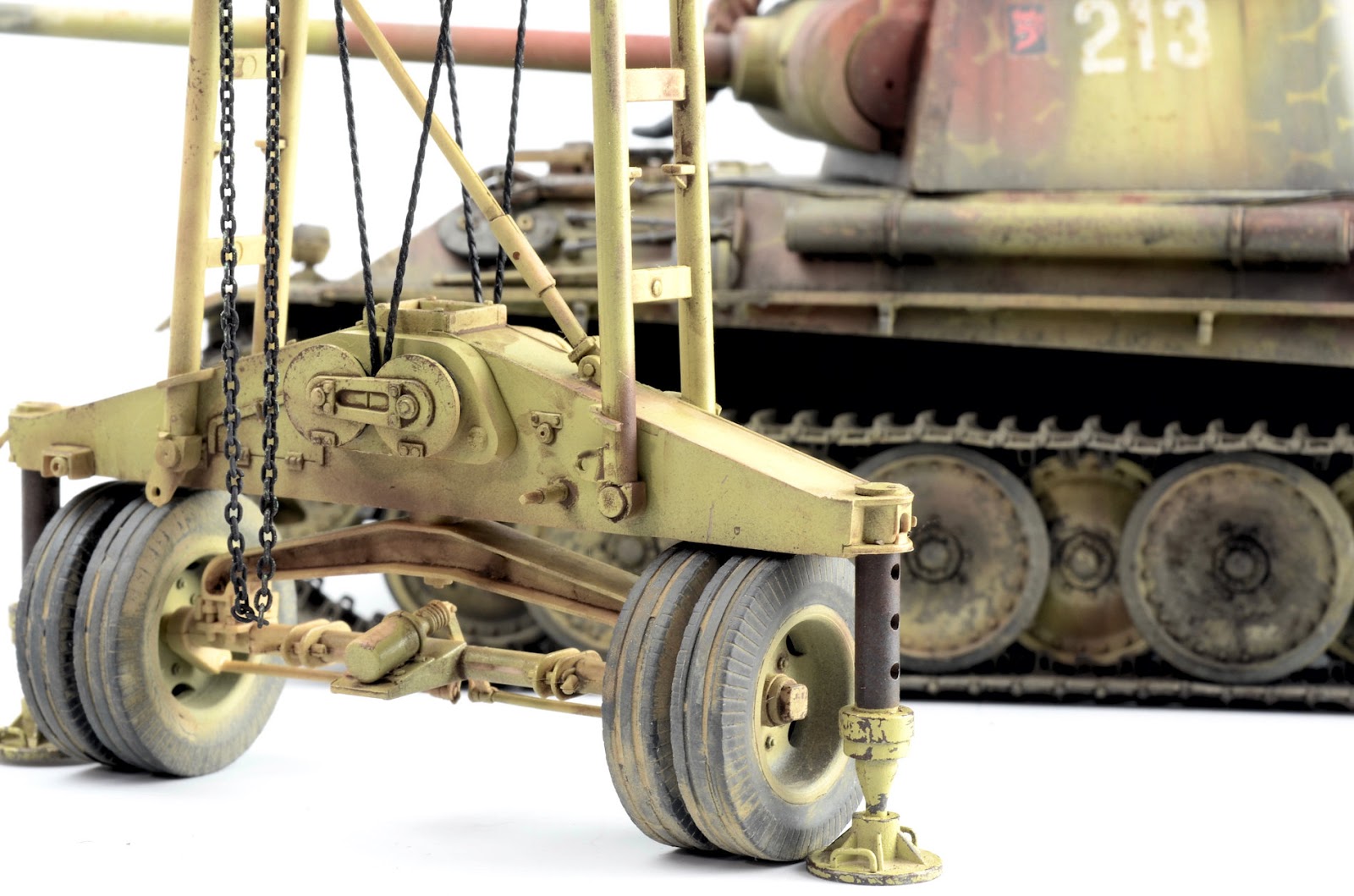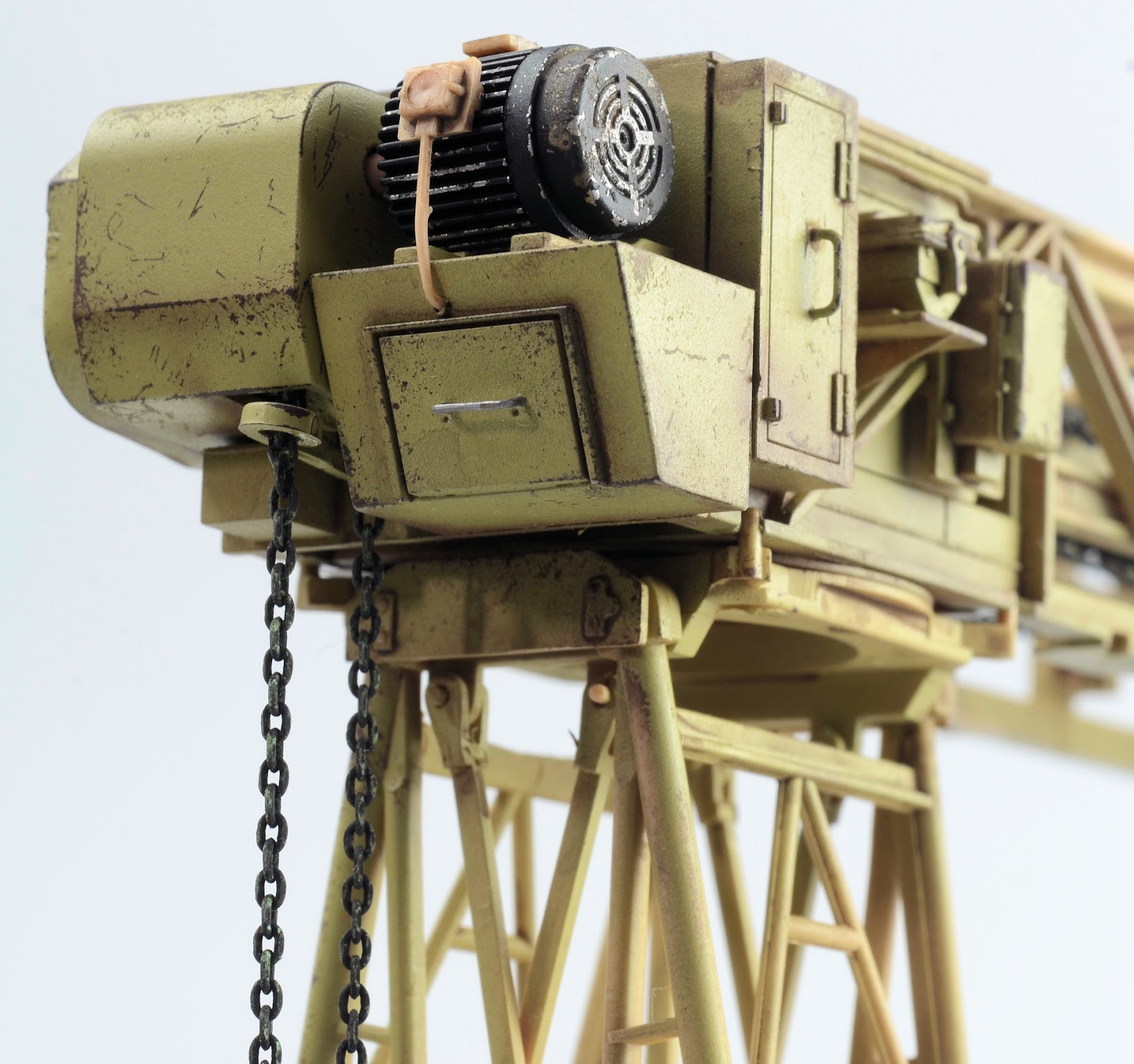 ROOKIE ERROR right here¡¦ Stupidly I didn¡¯t read the instruction sheet properly and rather than using the chain at this step, I used the rope supplied in the kit. I have left this faux-par in the guide to serve as a warning to others. Read the instructions properly! Back to this one later¡¦I wanted to represent the crane in a somewhat ¡®used¡¯ fashion¡¦but not too ¡®used¡¯ (if that makes any sense at all??) Some of the pieces were completely sprayed using AK Real Color Rotbraun, whilst others just have sections of the part sprayed in the colour. I find the lacquer offers a really sturdy base to build on. The parts then received a couple of coats of hairspray and once dry was painted using an acrylic-based Dunkelgelb. I find the hairspray chipping using the acrylic is a little more predictable than the lacquer paints. Once the paint has dried, a brush moistened with water is used to work away the top layer of paint to reveal the colour underneath. The effect is quite convincing.