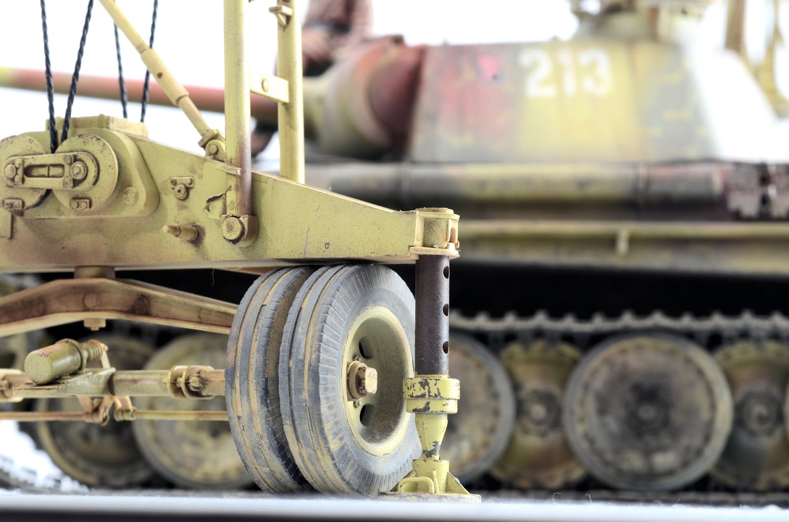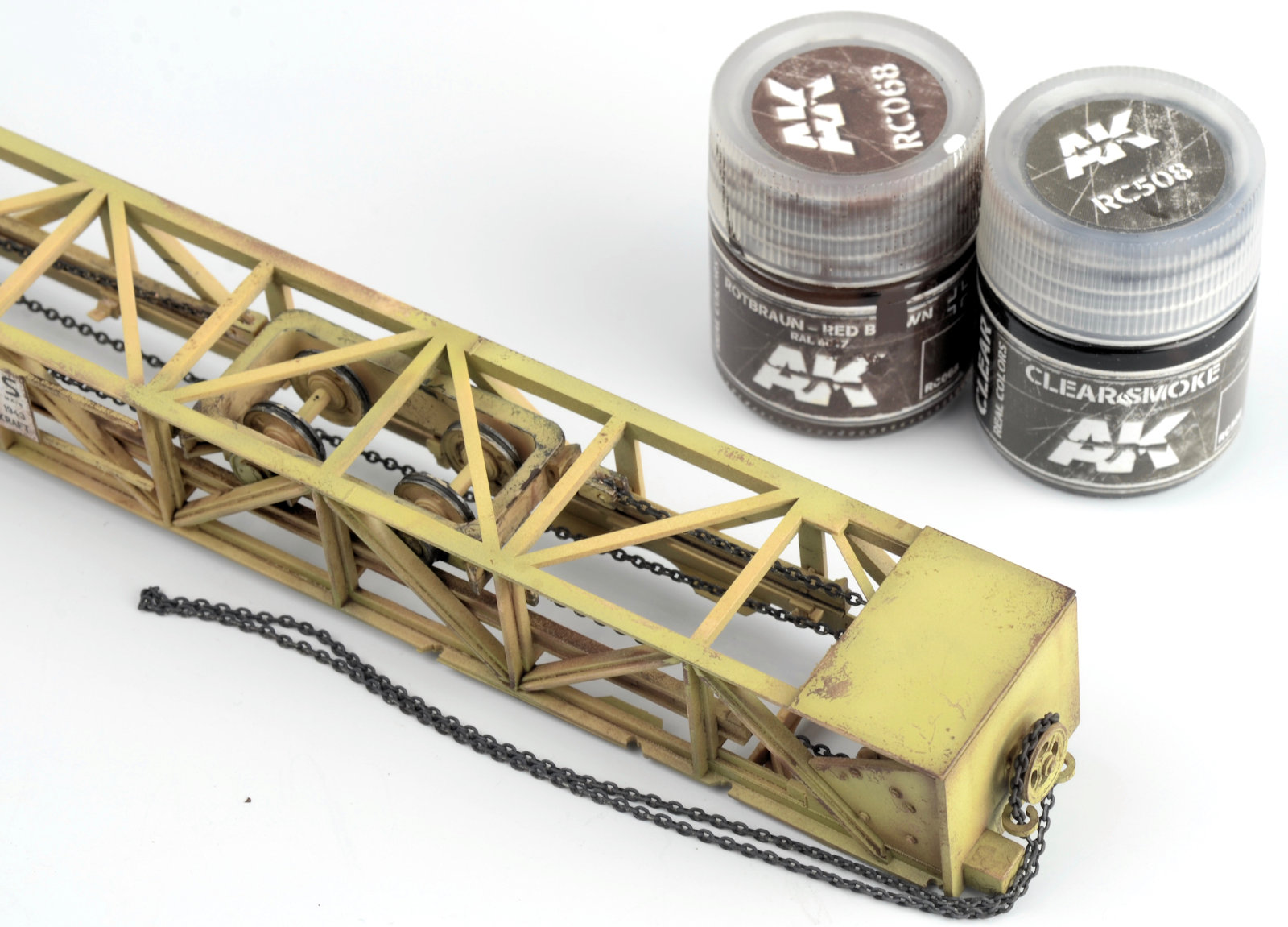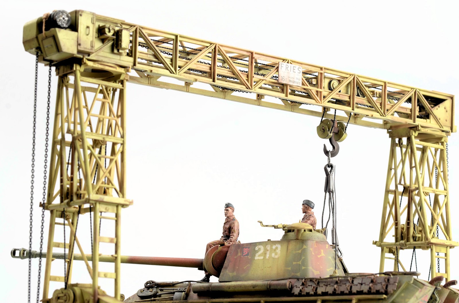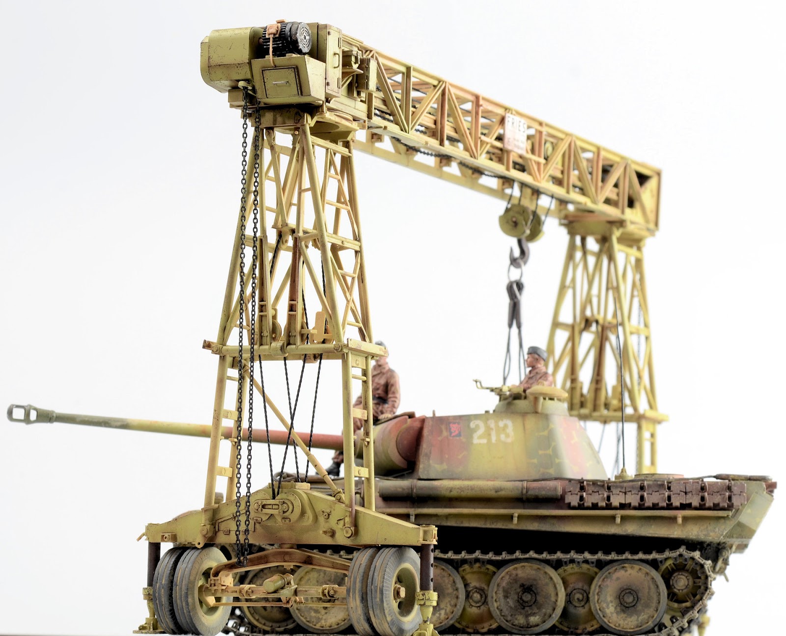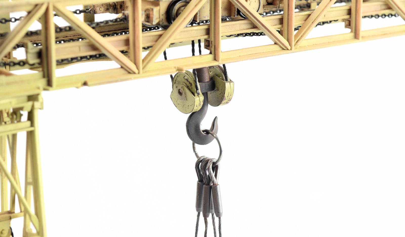 ROOKIE ERROR right here¡¦ Stupidly I didn¡¯t read the instruction sheet properly and rather than using the chain at this step, I used the rope supplied in the kit. I have left this faux-par in the guide to serve as a warning to others. Read the instructions properly! Back to this one later¡¦I wanted to represent the crane in a somewhat ¡®used¡¯ fashion¡¦but not too ¡®used¡¯ (if that makes any sense at all??) Some of the pieces were completely sprayed using AK Real Color Rotbraun, whilst others just have sections of the part sprayed in the colour. I find the lacquer offers a really sturdy base to build on. The parts then received a couple of coats of hairspray and once dry was painted using an acrylic-based Dunkelgelb. I find the hairspray chipping using the acrylic is a little more predictable than the lacquer paints. Once the paint has dried, a brush moistened with water is used to work away the top layer of paint to reveal the colour underneath. The effect is quite convincing.