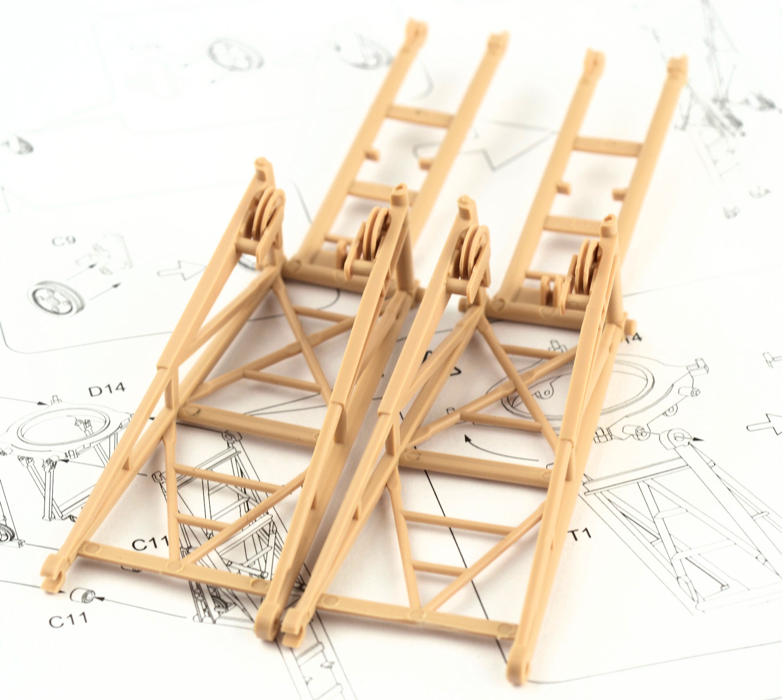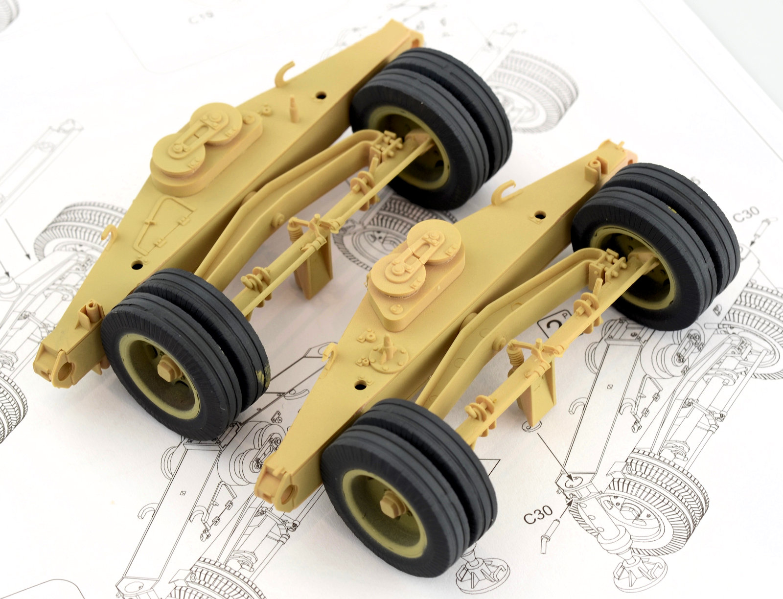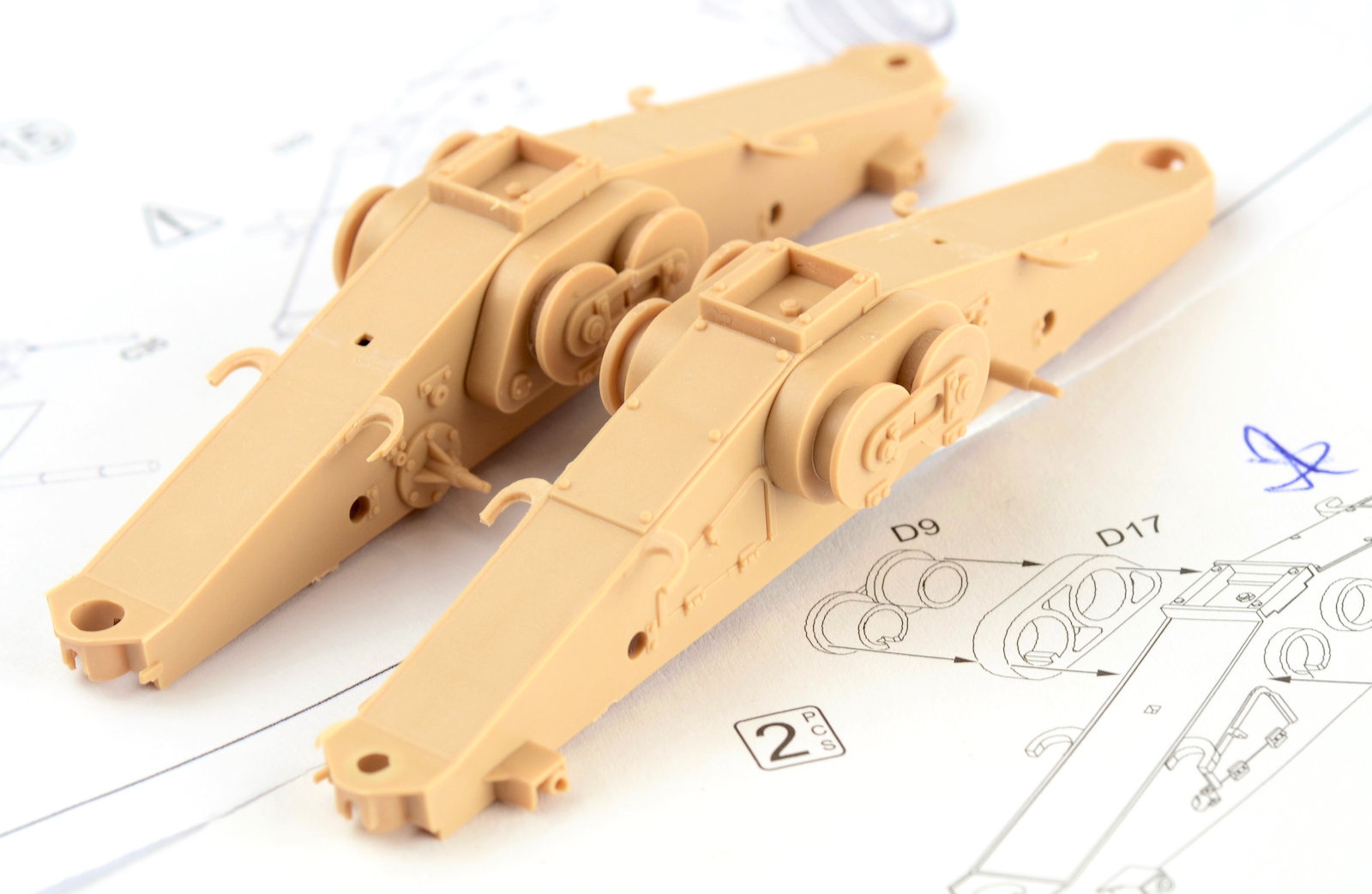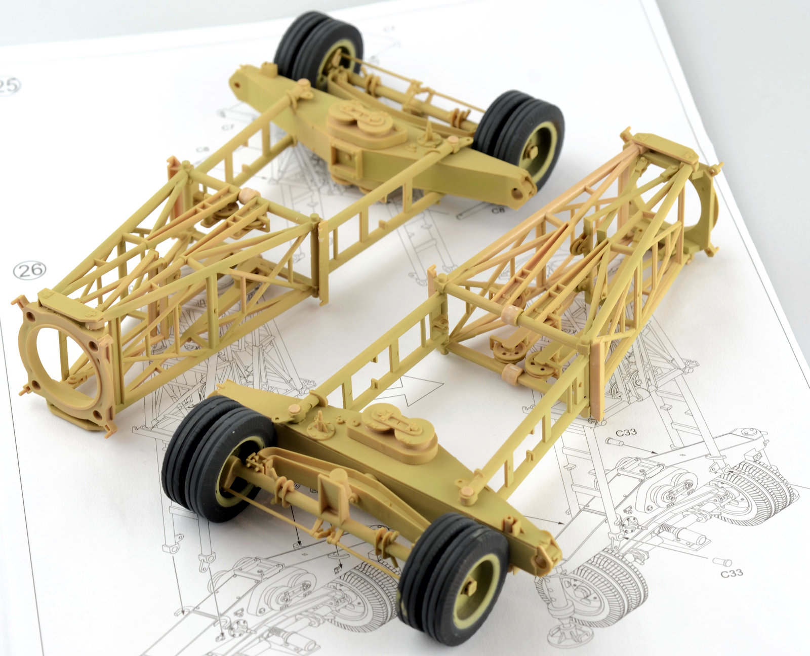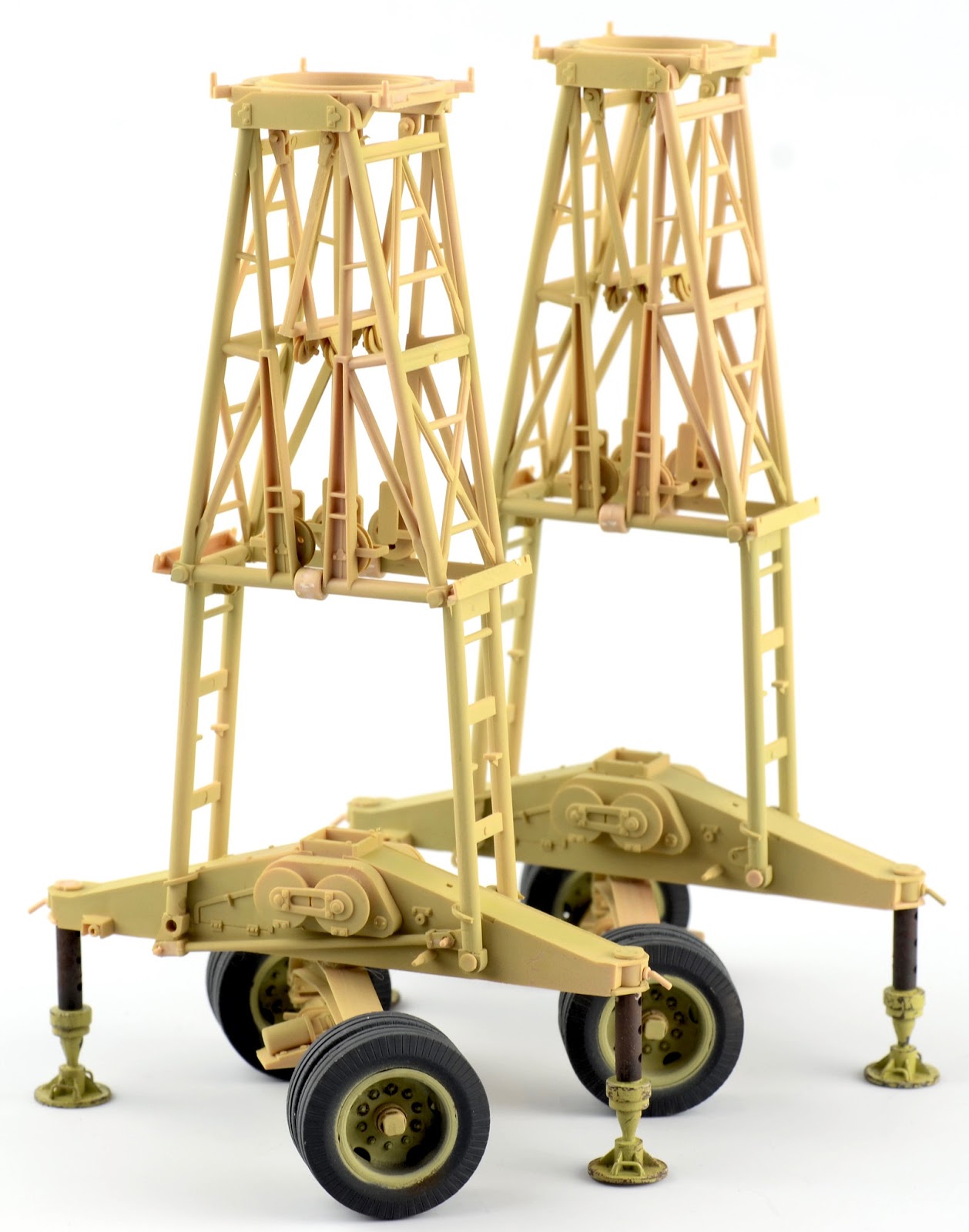 The wheels are now treated to a quick paint job. Firstly, I sprayed them in AK Real Color Rubber Black. The paint dries really fast, and soon after, with the aid of a spraying template, I set the Dunkelgelb in place in the rims. It is a little rough at this stage, but it was just to make the painting a little easier down the track. The wheels are now fitted to the axels and the axels are then attached to the support arms. Again, you may notice the ejector pin marks in the support for the axel. Recessed and very hard to clean up, so I just turned a blind eye to them. Technically the trolley shouldn¡¯t be able to be removed from the top structure, but by prying the piece apart I was able to remove the part in order to paint and weather it. It is a little messy, but I figured it would be a high wear part and would have looked pretty beaten up. The chipping was painted using a fine brush as well as employing the sponge technique.The two main pieces for the legs are now attached together. All feels very sturdy at this stage.